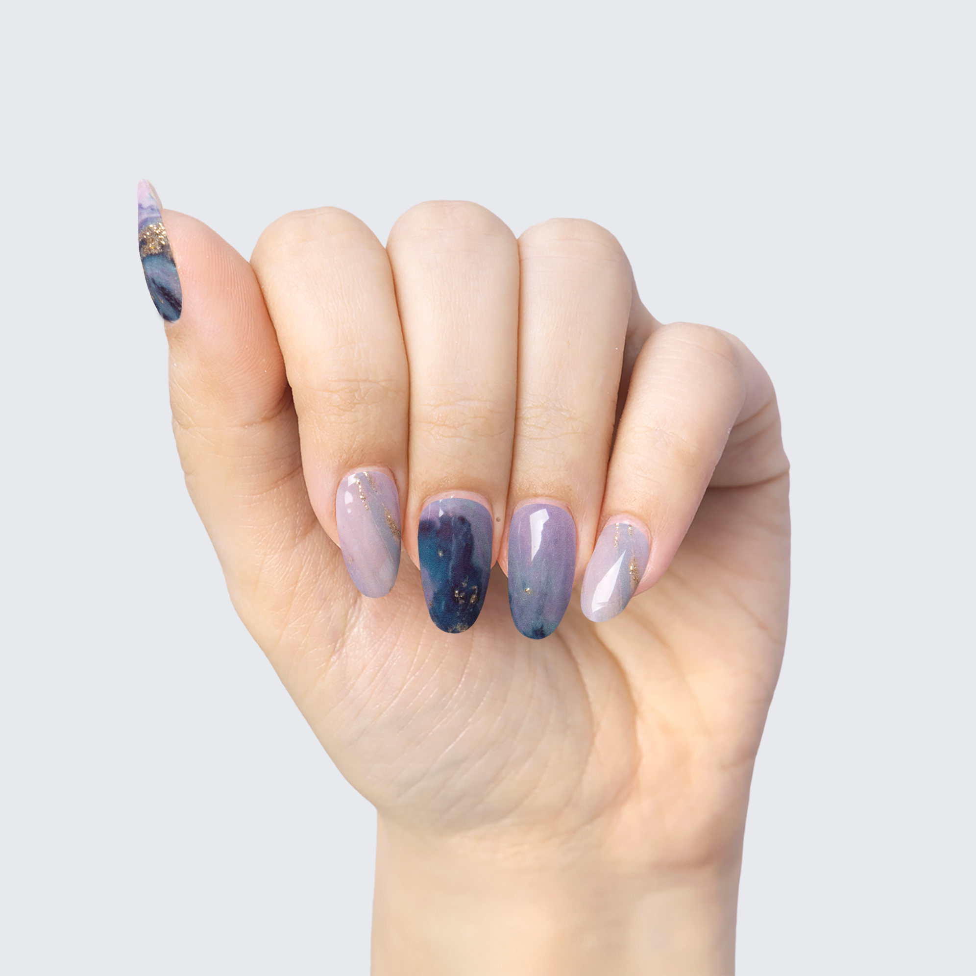 Marble swirl pattern of navy, aqua, and pastel blue, with varying shades of pink, purple, fuchsia, and white. Gold glitter accents. Semi-transparent. Mixed undertones.