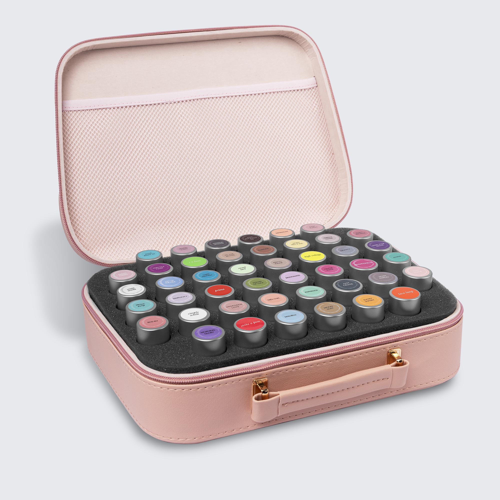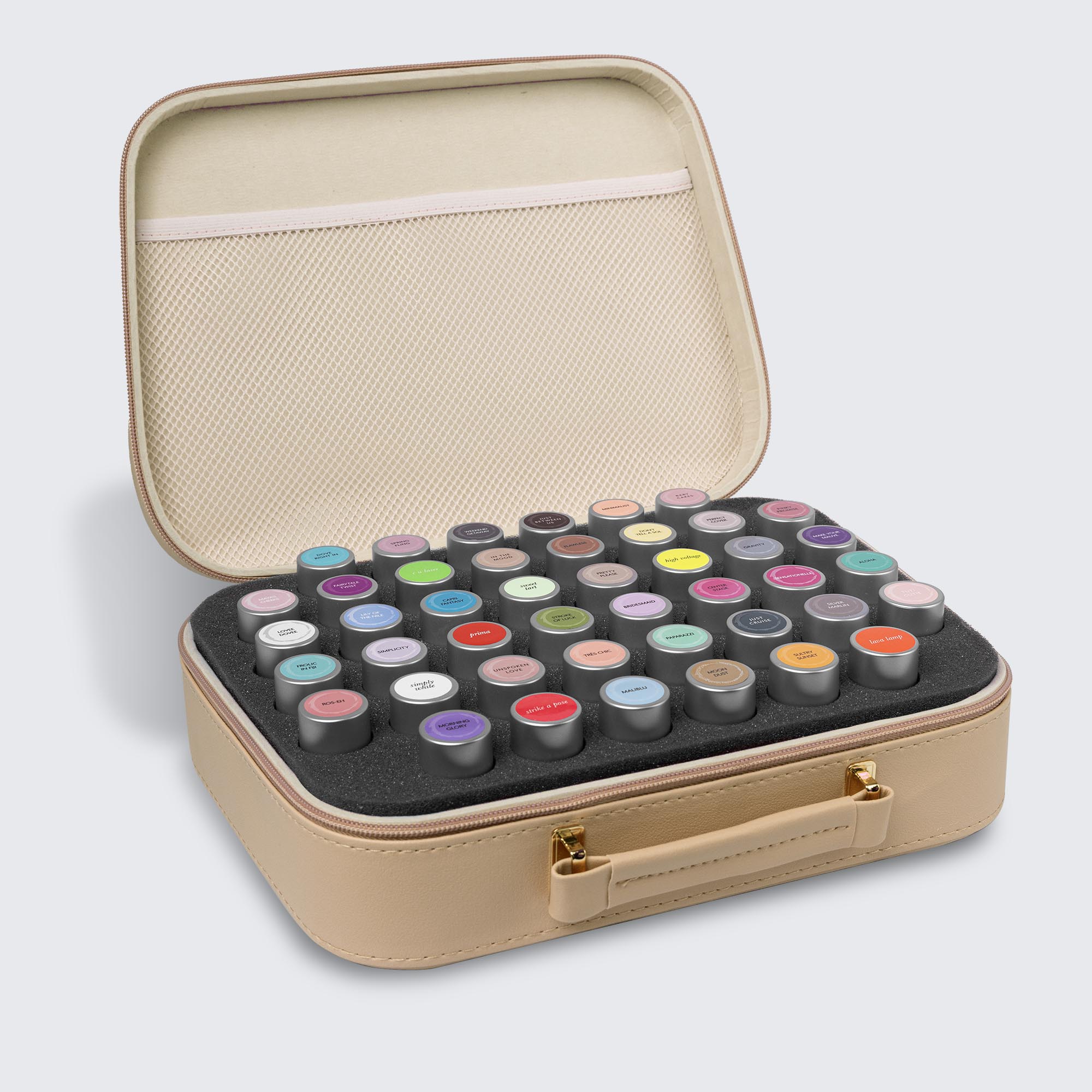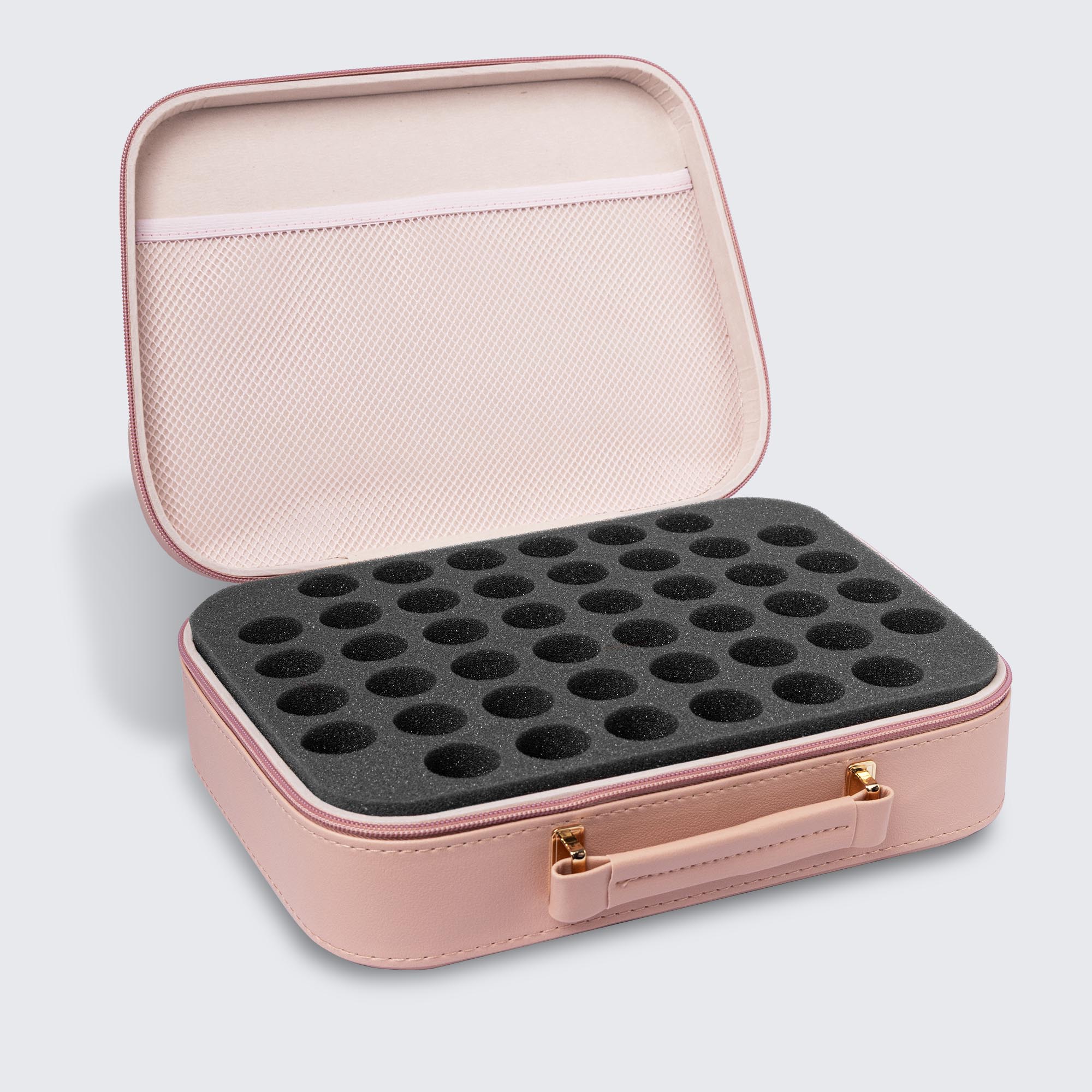 Large foam insert holds up to 44 polish bottles.