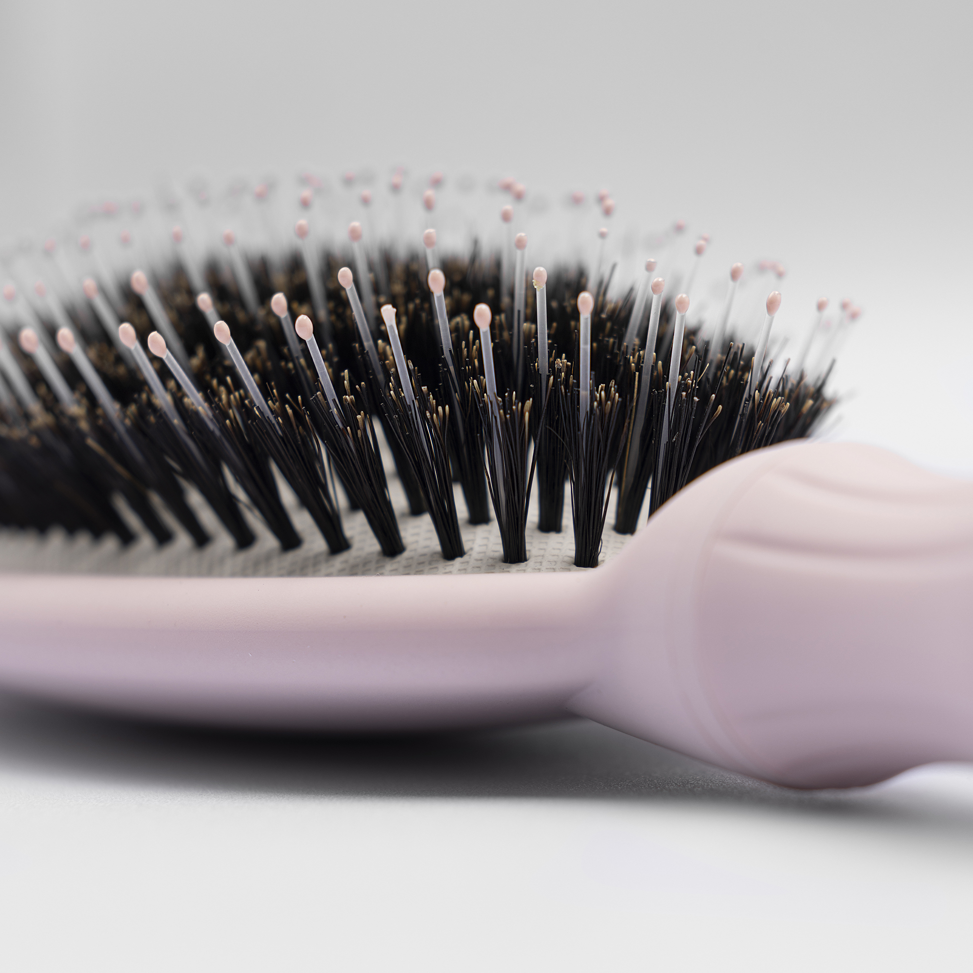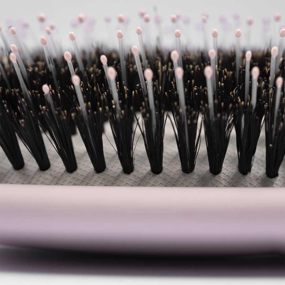 Bristles - made of a premium nylon and boar hair mix to help enhance shine and reduce frizz. With special epoxy ball point tips and a soft, air-filled cushion that helps ensure an easy, pain free brushing and static free hair every time.